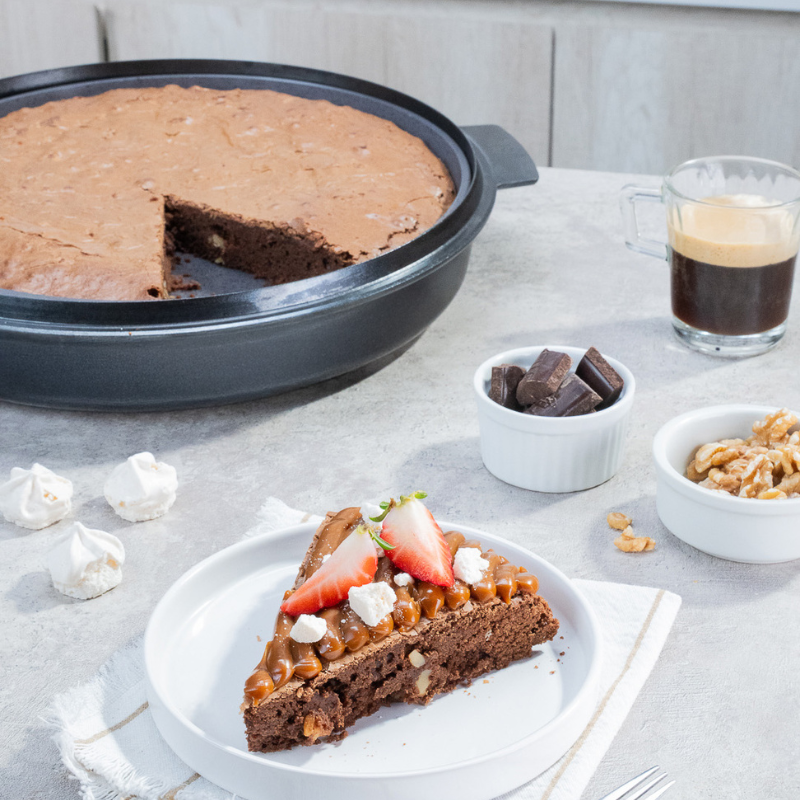 En una Cacerola de 18cm a Fuego Corona derretimos el chocolate cortado en trozos con la manteca hasta que se fundan. Volcamos en un bowl y agregamos el azúcar, los huevos, luego la harina, polvo de hornear y las nueces picadas. Mezclamos la preparación y la volcamos en la Bandeja. Colocamos la bandeja sobre la rejilla con el Kamado Precalentado a 180°. Cocinamos por 15 minutos a Fuego Máximo, apagamos y dejamos tapado por 10 minutos. Retiramos con la manija extractora. Dejamos enfriar, desmoldamos y cortamos porciones. Acompañamos con dulce de leche, frutillas y merengues.