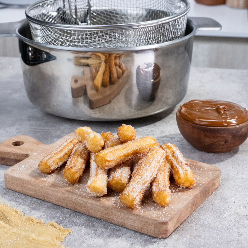 Ubicamos los churros sobre el cestillo multifunción y los sumergimos en el aceite caliente, tapamos y freímos a Fuego Medio. Cuando los churros estén dorados los retiramos y los espolvoreamos con azúcar. Acompañamos con dulce de leche.